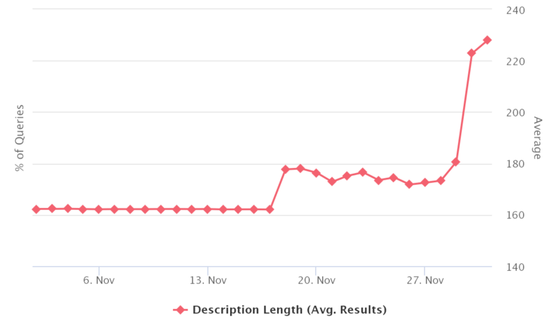 Sin embargo, esta prueba ha llegado para quedarse y no hablamos de un pequeño cambio si no de un aumento de hasta 230 caracteres según las últimas informaciones. Aquí os dejamos un pequeño gráfico que ha colgado RankRanger sobre el aumento de caracteres durante este mes.